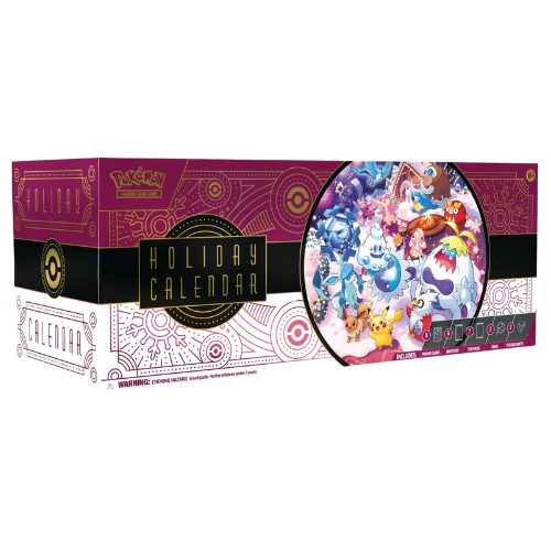 Card Text: | 25 Days of Pokémon TCG Surprises! Celebrate the season with 25 days of surprises in the Pokémon TCG: Holiday Calendar! From special foil cards to booster packs and more, there’s a different Pokémon goodie to open every day. The Pokémon TCG: Holiday Calendar includes 25 surprises to discover: • 8 foil Pokémon TCG cards with a festive stamp • 6 Pokémon TCG booster packs • 7 Pokémon TCG 3-card fun packs • 2 Pokémon coins • 2 Pokémon sticker sheets • Plus, find a code card for Pokémon TCG Live! |