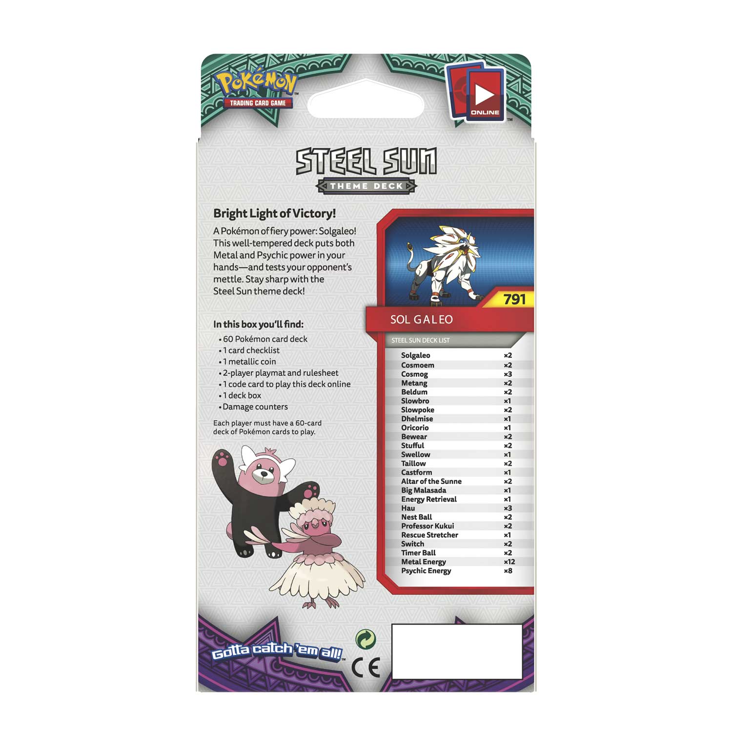 A Pokémon of fiery power: Solgaleo! This well-tempered deck puts both Metal and Psychic power in your hands—and tests your opponent's mettle. Stay sharp with the Steel Sun theme deck!