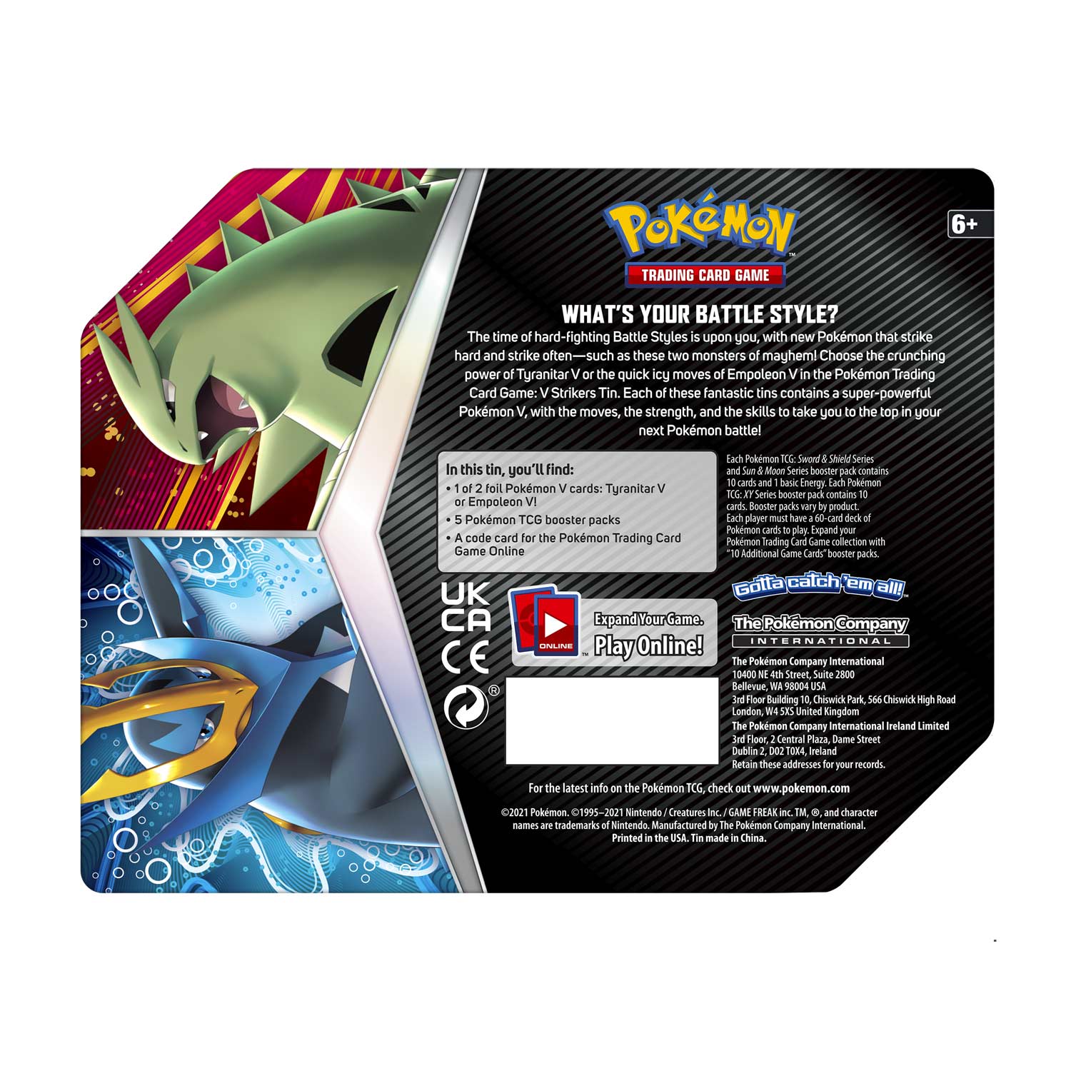 The time of hard-fighting Battle Styles is upon you, with new Pokémon that strike hard and strike often—such as this monster of mayhem! Choose the quick icy moves of Empoleon V in the Pokémon Trading Card Game: V Strikers Tin. This fantastic tin contains a super-powerful Pokémon V, with the moves, the strength, and the skills to take you to the top in your next Pokémon battle!